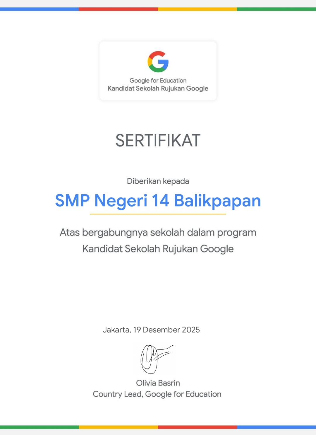Assalamu'alaikum Wr. Wb. Puji syukur kami panjatkan kehadirat ALLAH SWT atas limpahan rahmat dan karunia-Nya sehingga website SMP Negeri 14 Balikpapan dengan nama smpn14bpn.sch.id berhasil kami kembangkan. Di era global dan pesatnya Teknologi Informasi dan Komunikasi ini, tidak dipungkiri bahwa keberadaan sebuah website untuk suatu sekolah, termasuk SMP Negeri 14 Balikpapan, sangatlah penting. Website dapat digunakan sebagai media penyebarluasan informasi dari sekolah, yang memang harus diketahui oleh stake holder secara luas. Disamping itu, website juga dapat menjadi sarana promosi sekolah yang cukup efektif. Berbagai kegiatan positif sekolah dapat diunggah, sehingga masyarakat dapat mengetahui prestasi yang telah berhasil diraih oleh siswa siswi SMP Negeri 14 Balikpapan.